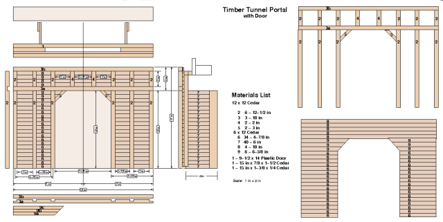 Tunnel portals dress up the entrance to tunnels. They also help hold the surrounding ground in place so that it does not fall on the tracks. I constructed wood portals for both entrances of Tunnels 2 and 3. They are made of red cedar and stained with walnut colored Danish Oil Finish. It gives a creosote treated appearance to the wood. This is an interior finish but has held up well outside. I don't mind if it weathers, that's just what wood does. Titebond III exterior wood glue was used in the construction.